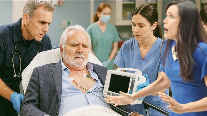 Suddenly, the moment that no one ever imagined happens. Eric clutches his chest mid-melody, gasping for air. Donna’s screams echo through the halls as he collapses. The next minutes unfold in frantic chaos — the call to 911, Ridge rushing home, Brooke trying to keep her composure, and the family gathered around as paramedics fight to revive him.